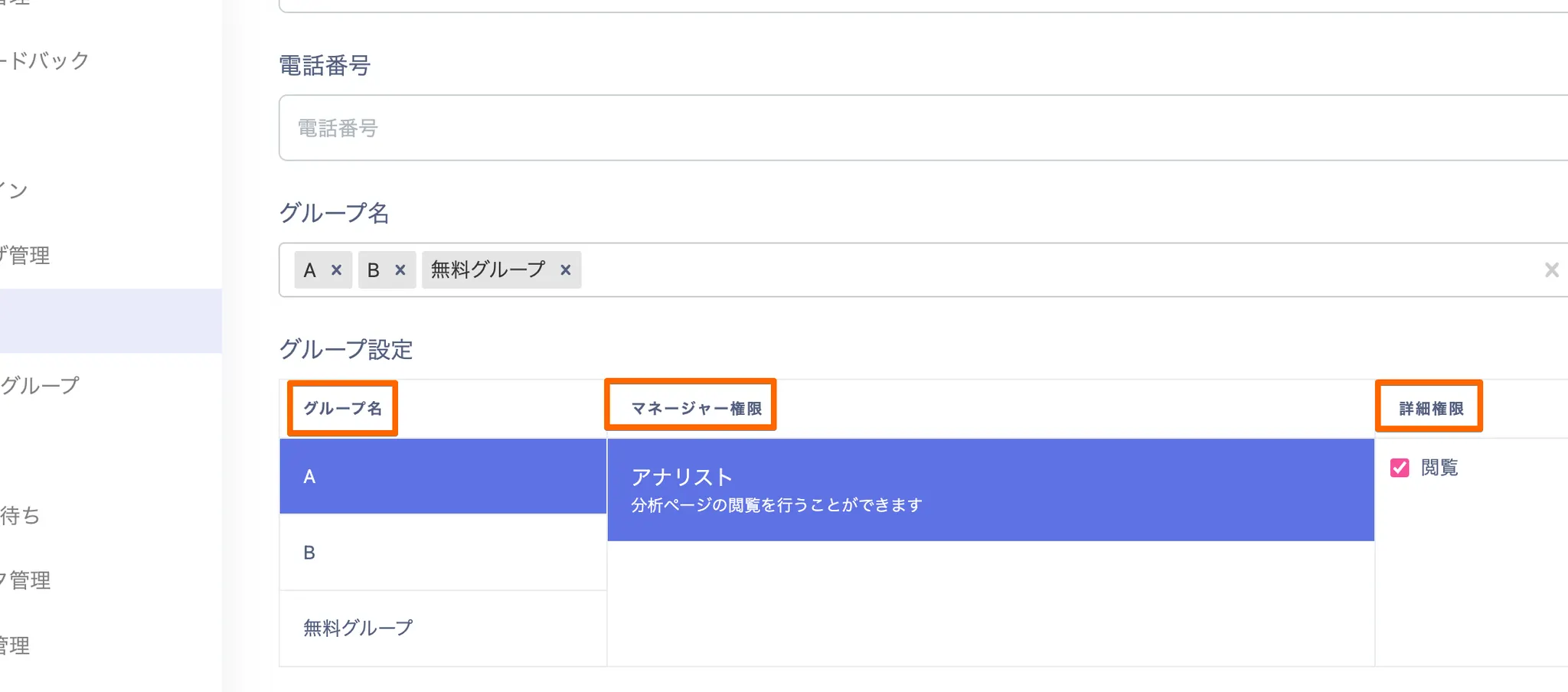 ②確認したい「グループ名」「マネージャー機能」「詳細権限」を設定、画面下部の「保存」