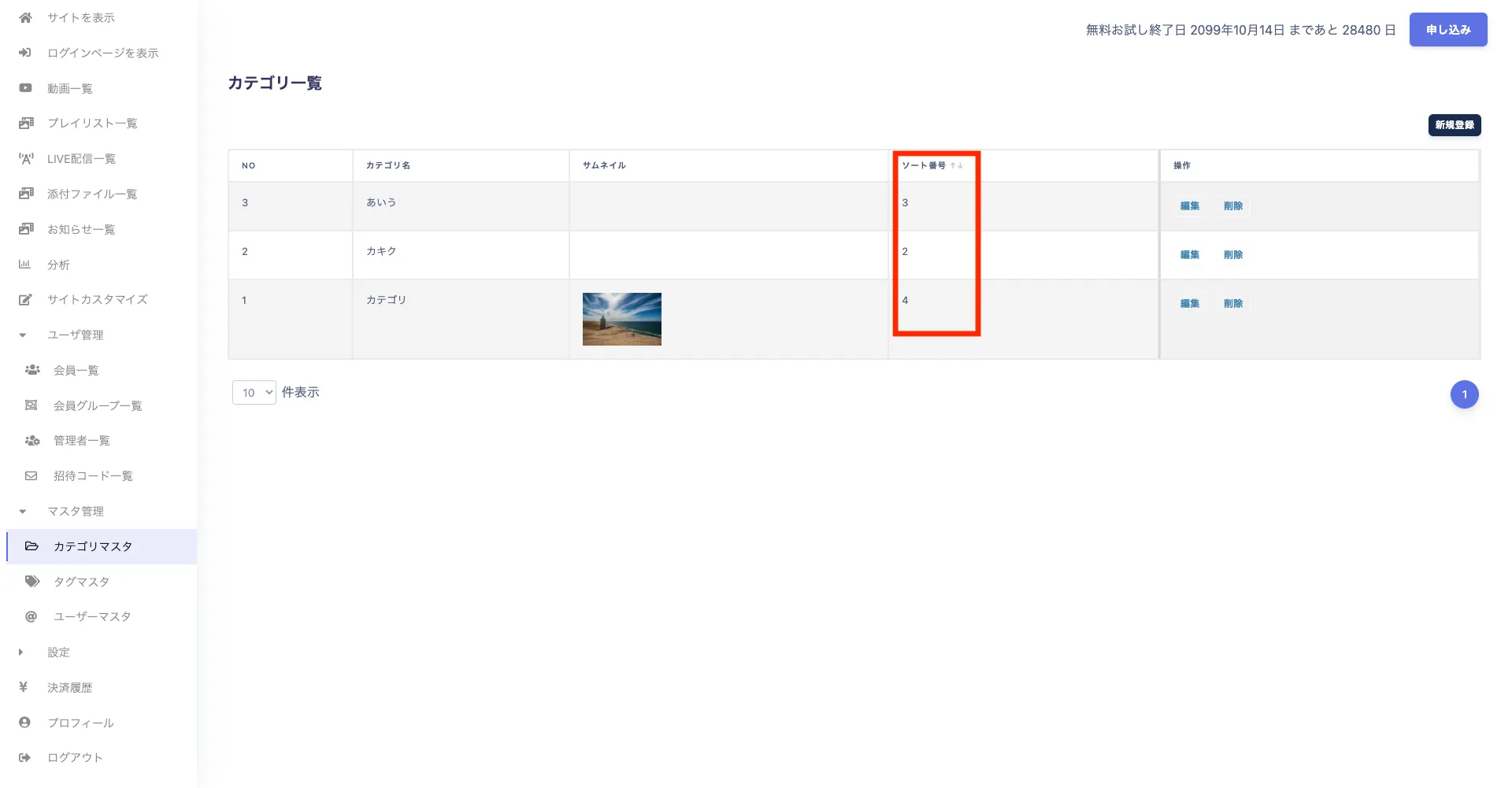 会員画面の方でソート番号が2⇨3⇨4の順番でカテゴリが表示されます