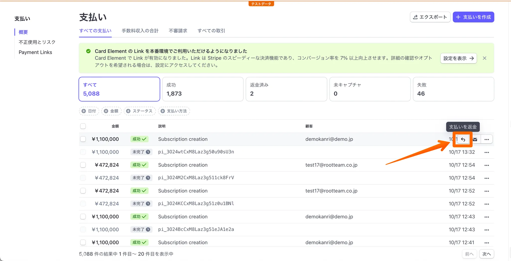 支払い一覧から該当の支払いを選択します。Stripeの支払いダッシュボード