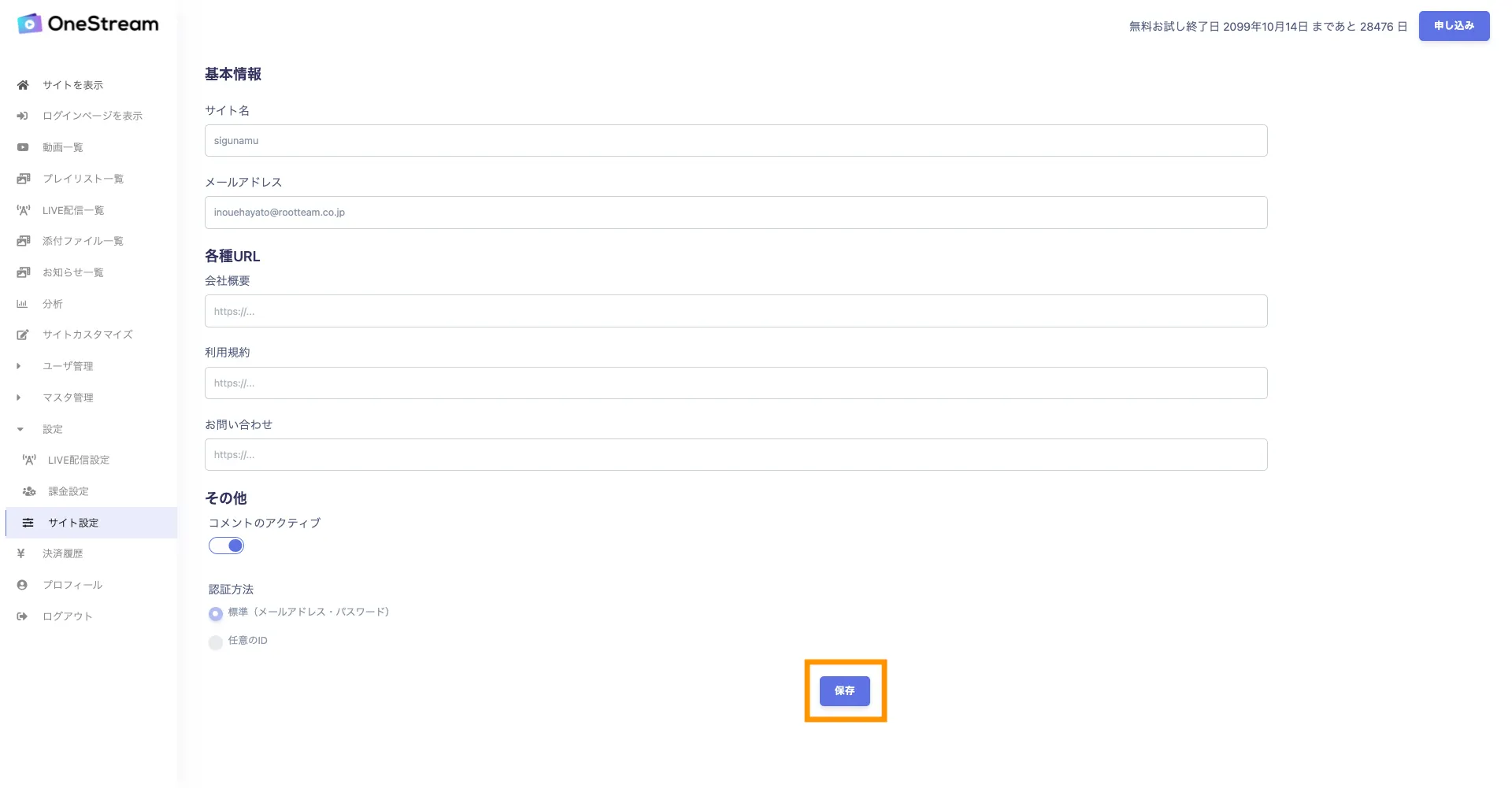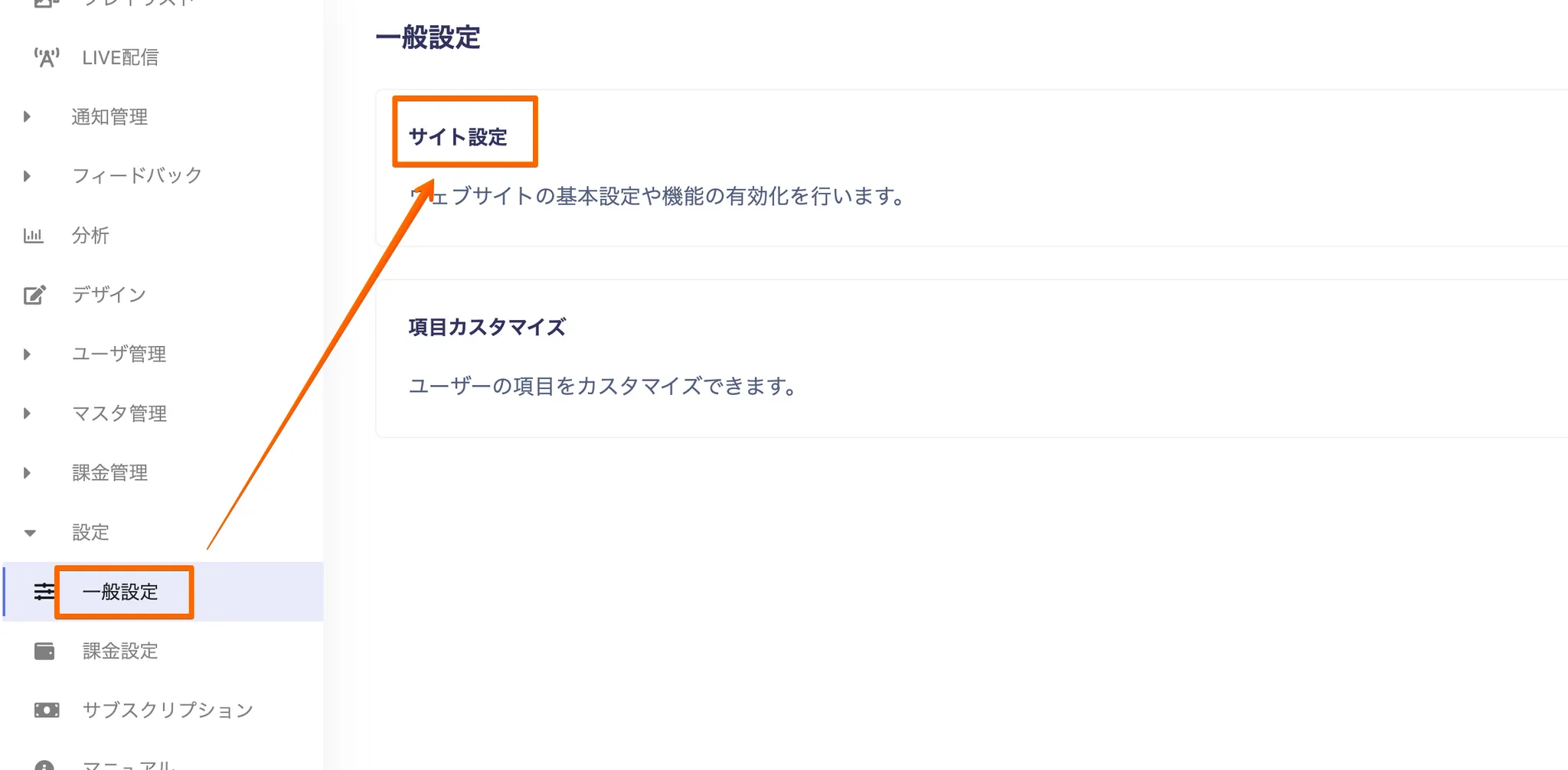1. サイドメニューから設定→一般設定→サイト設定を選択します