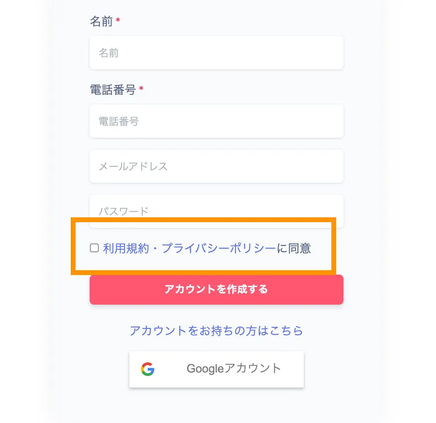 「利用規約・プライバシーポリシー」を設定頂くと、ログイン画面にチェックボックスが表示されます。