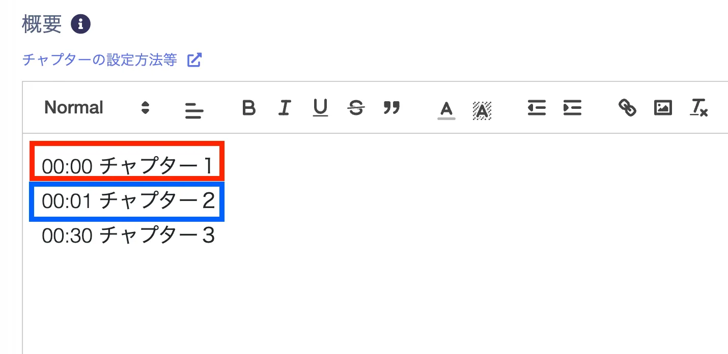 概要に、下記の形式で時間とタイトルを設定して下さい