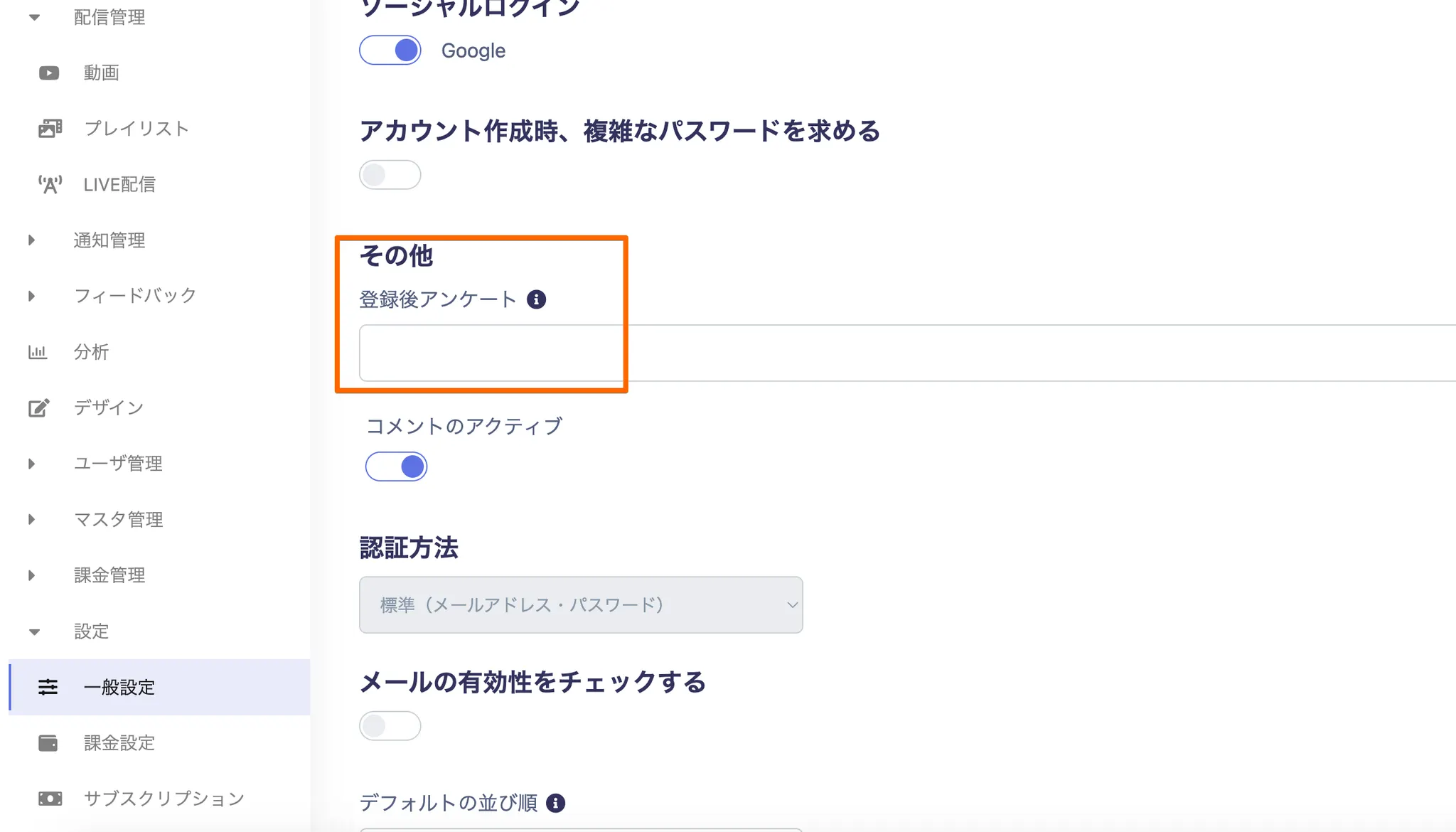 設定→一般設定→サイト設定の「登録後アンケート」より設定したいアンケートを選択し保存