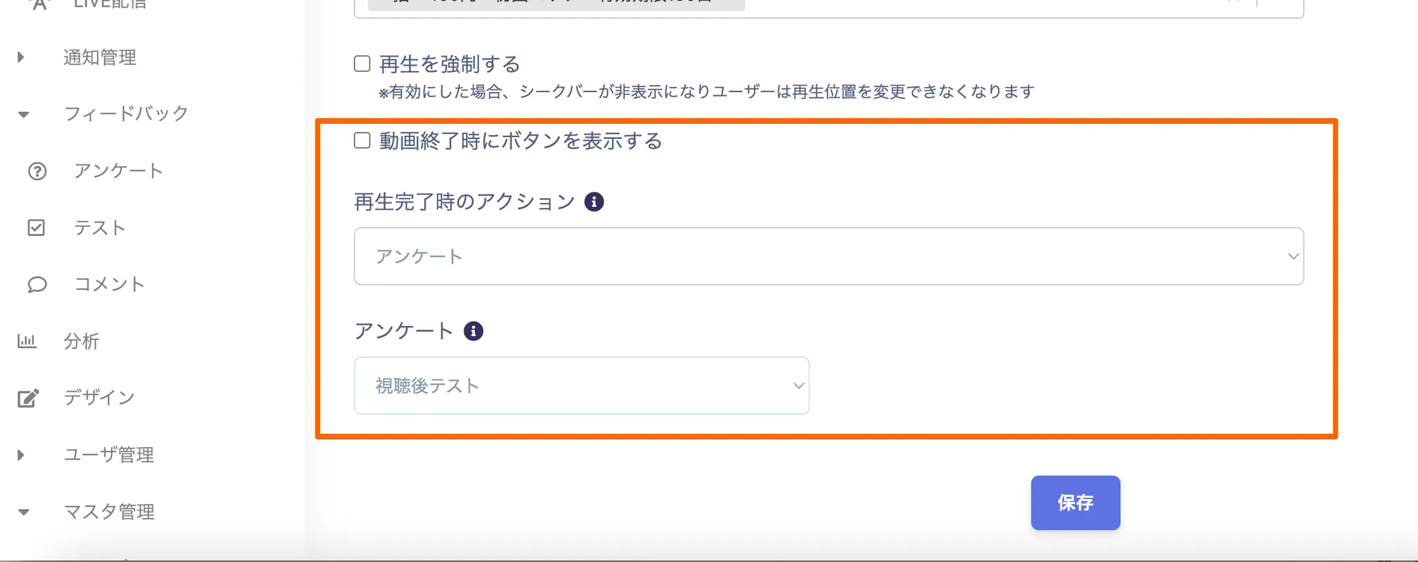 「再生完了時のアクション」より設定したいアンケートを選択し保存