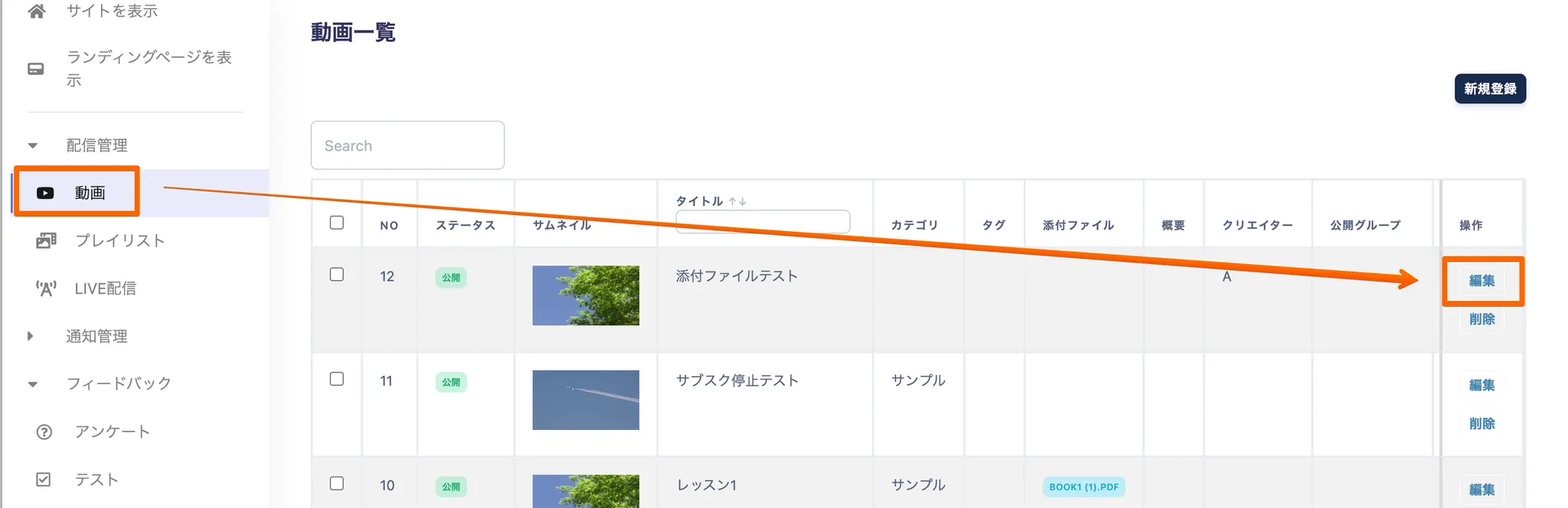 対象の動画の編集を押下