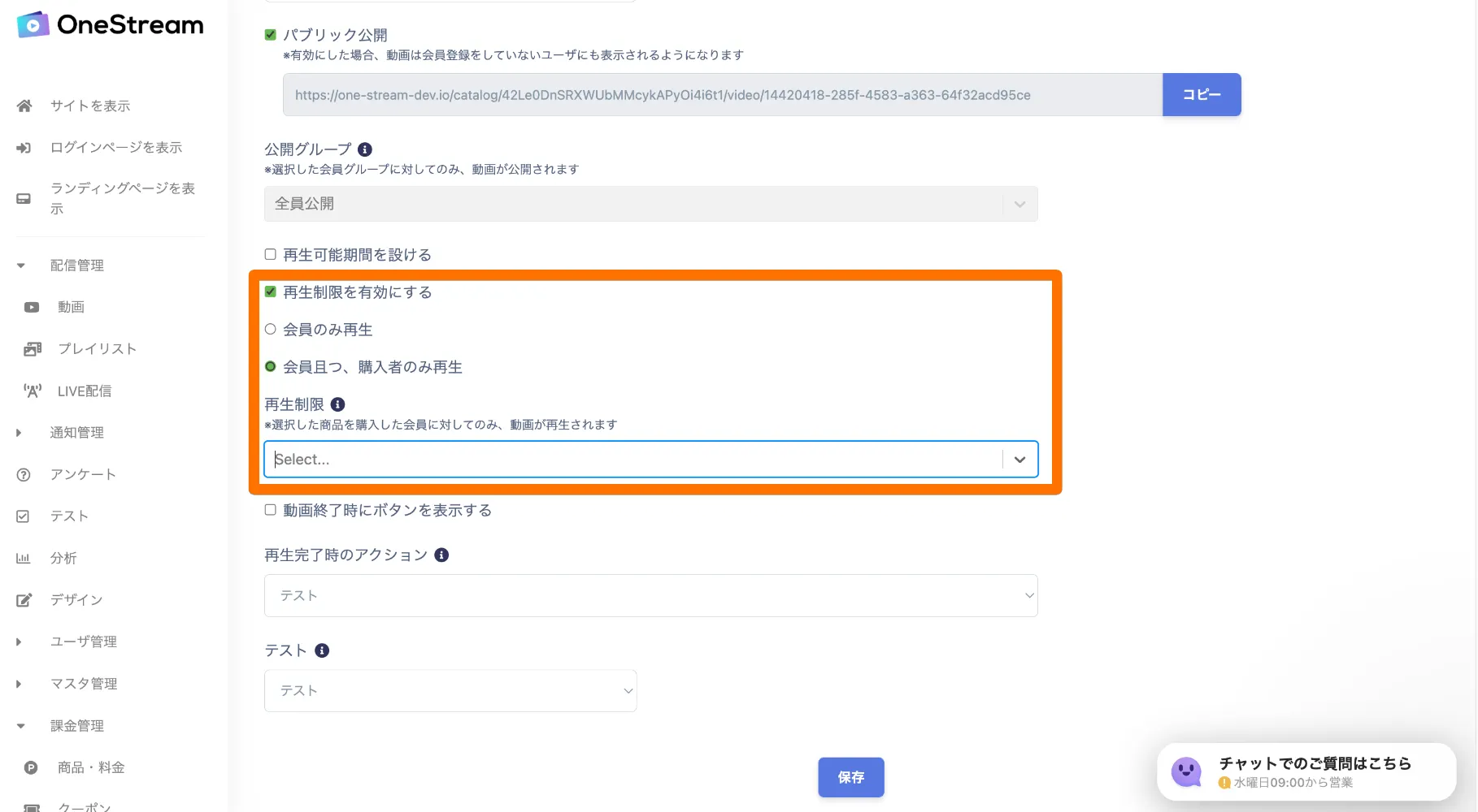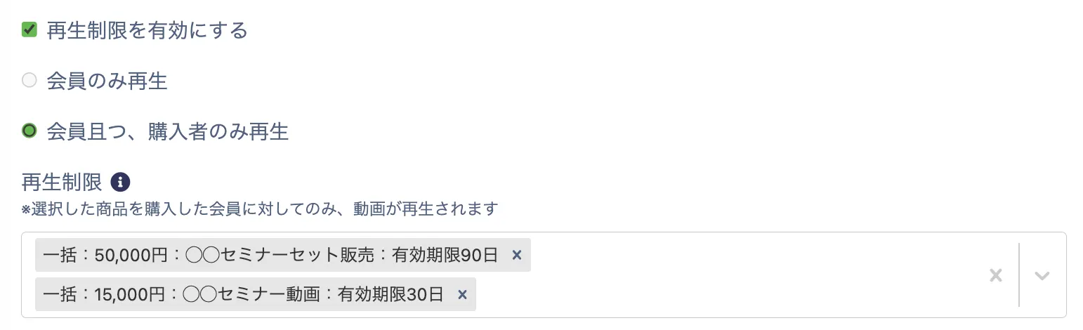 再生制限を有効にするをチェックし、「会員かつ、購入者のみ再生」を選択し、