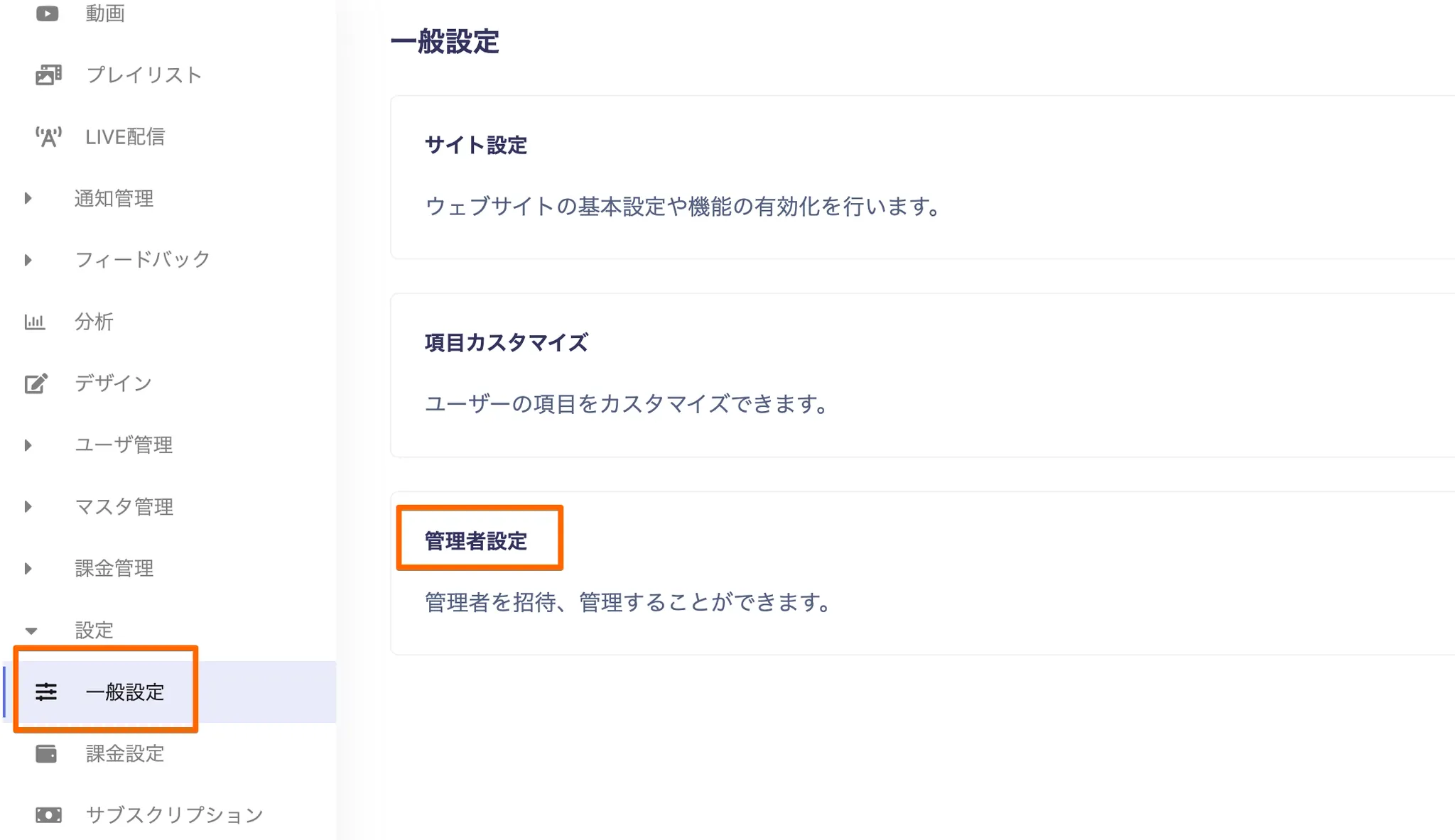 一般設定、管理者管理、サブスクリプション